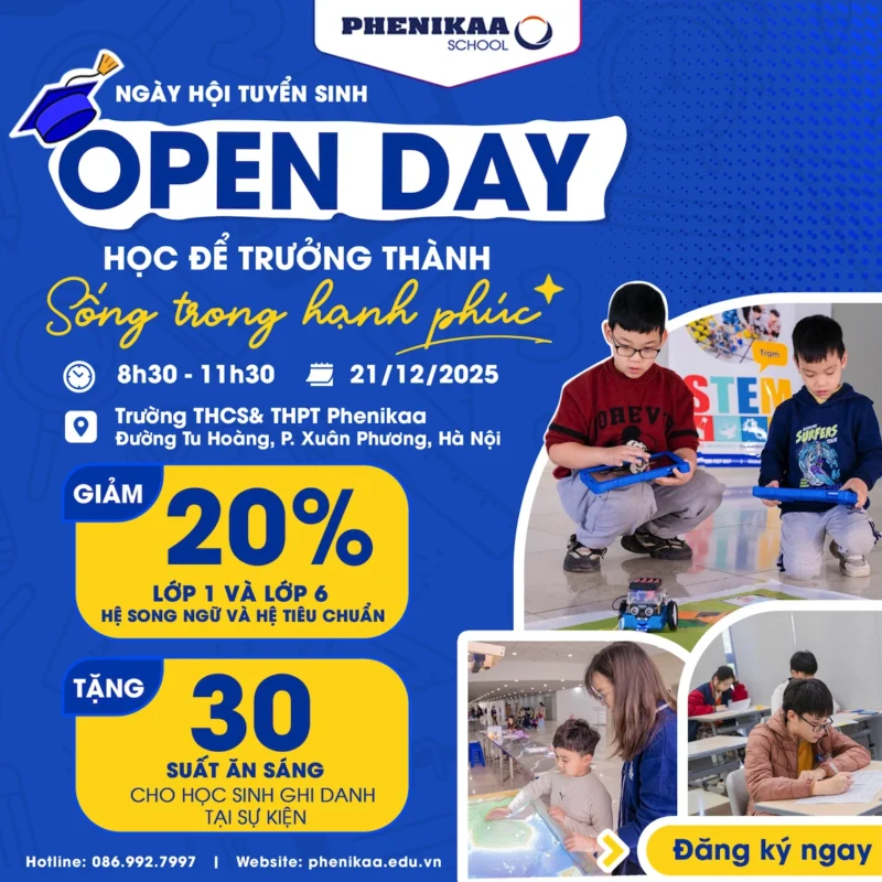 🏫✨CÙNG CON KHÁM PHÁ NGÔI TRƯỜNG HẠNH PHÚC – PHENIKAA SCHOOL Thời gian: 8:30-11h30, ngày 21/12/2025. Đăng ký tham dự ngay tại đây! PHENIKAA SCHOOL TUYỂN SINH TỪ LỚP 1 ĐẾN LỚP 11, NĂM HỌC 2026-2027 👉 Ba mẹ đang tìm một môi trường thật sự an tâm, nhân văn để đồng hành cùng con suốt những năm tháng học đường? 👉 Hãy đến Phenikaa School để trải nghiệm một không gian giáo dục hiện đại và truyền cảm hứng, nơi cả gia đình có thể cảm nhận rõ ràng môi trường học tập khác biệt dành cho con. 🎁 QUÀ TẶNG ĐẶC BIỆT CHỈ DÀNH CHO PHỤ HUYNH THAM DỰ OPEN DAY 21/12/2025 🌟Giảm 30% học phí cho học sinh nhập học vào lớp 10 hệ Song ngữ trước 31/3/2026 🌟 Giảm 20% học phí cho học sinh nhập học vào lớp 1,6 hệ Song ngữ và Tiêu chuẩn trước ngày 31/3/2026 🌟 Tặng 30 suất ăn sáng cho …